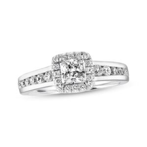 The center of this pretty engagement ring features a princess-cut diamond center resting in a glimmering frame of round diamonds. Additional round diamonds are in the 14K white gold band, bringing the total weight of the ring to 5/8 carat. From the Now & Forever? Bridal Collection.